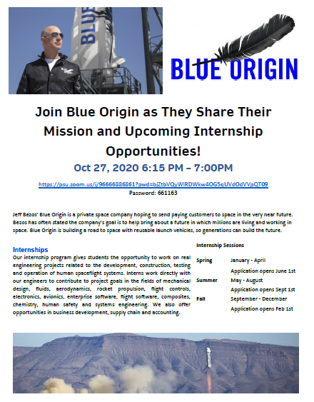 Jeff Bezo's Blue Origin space company will be presenting to Penn State students on October 27th at 6:15pm - 7:00pm sharing their mission and internship opportunities.